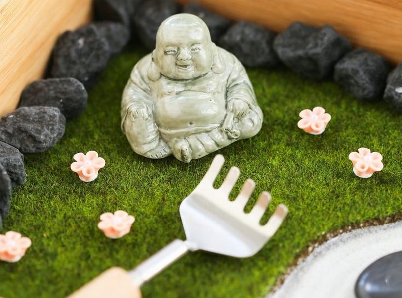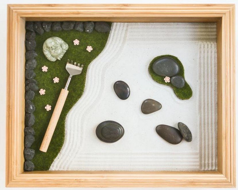 Он представляет собой полный аналог полноценного варианта. Миниатюрный сад камней имеет основные атрибуты настоящего, а именно статуэтку Будды, траву, а также чистый белый песок.