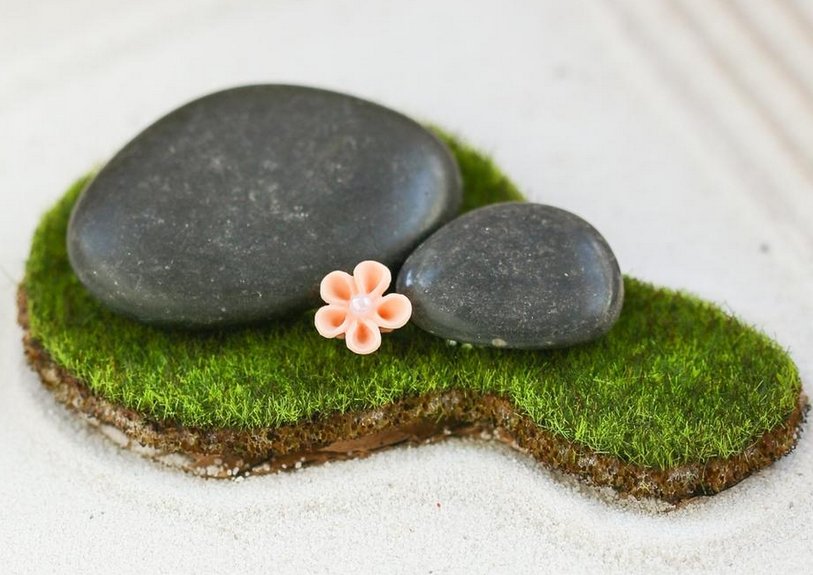 6. Искусственный мох украшается камнями, статуэткой Будды и маленькими декоративными цветочками.