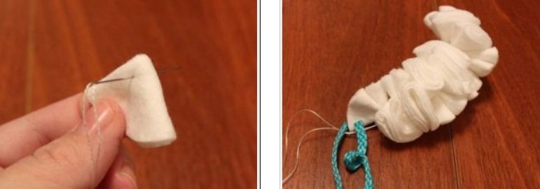 Далее вам нужно будет нанизать все эти 15 заготовок на белую нитку, желательно очень крепкую. Кончики нитки аккуратно завяжите, а сами диски расправьте и распределите так, чтобы придать им форму белого шара.