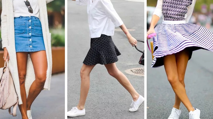 - Очень выигрышно смотрится сочетание кроссовок с юбкой миди (длина чуть ниже колена), при этом предпочтение следует отдавать ярким и умеренным цветам (пастельные, нюдовые и темные тона). А присутствие небольшого аксессуара только дополнит ваш образ!