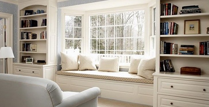 - Диванчик у небольшого окна. Такой диван можно смело сооружать в любой комнате. Конечно, подоконник придется удлинить и опустить немного. Этот вариант лучше продумывать до того, как поменять окно. Тогда можно легко заказать стеклопакет, который будет соответствовать всем требованиям. Даже у самого маленького окошка можно установить небольшое место для чтения. А как приятно посмотреть на ночную улицу с чашечкой горячего кофе. Стоит отметить, что пейзаж в этом случае имеет значение.