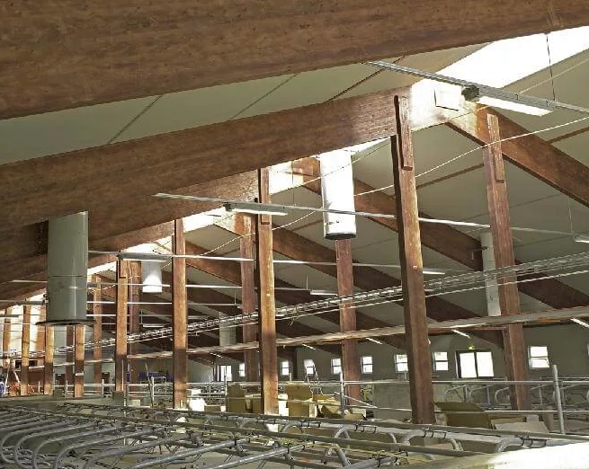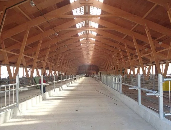 Он легко поддается обработке как в процессе производства, так и на строительных площадках. Высокие эксплуатационные качества позволяют использовать его для таких сложных (по условиям эксплуатации) комплексов. Деревянные конструкции создают естественный микроклимат, комфортный и для животных, и для обслуживающего персонала.