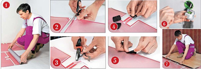Популярность напольных систем обогрева неуклонно растет. Это абсолютно объяснимо, ведь они имеют немало плюсов: позволяют равномерно отопить помещение, занимают минимум места, экономят электроэнергию и отлично вписываются в концепцию экологичного дома. Есть у них и еще одно важное достоинство — простой и быстрый монтаж, который вполне под силу опытным домашним мастерам.Закрываем выровненный и очищенный черновой пол подложкой из вспененного полиэтилена. Раскатываем нагревательную пленку.